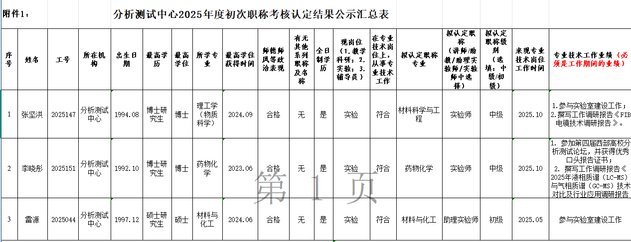 附件:2025年度分析测试中心初次职称考核认定结果公示汇总表